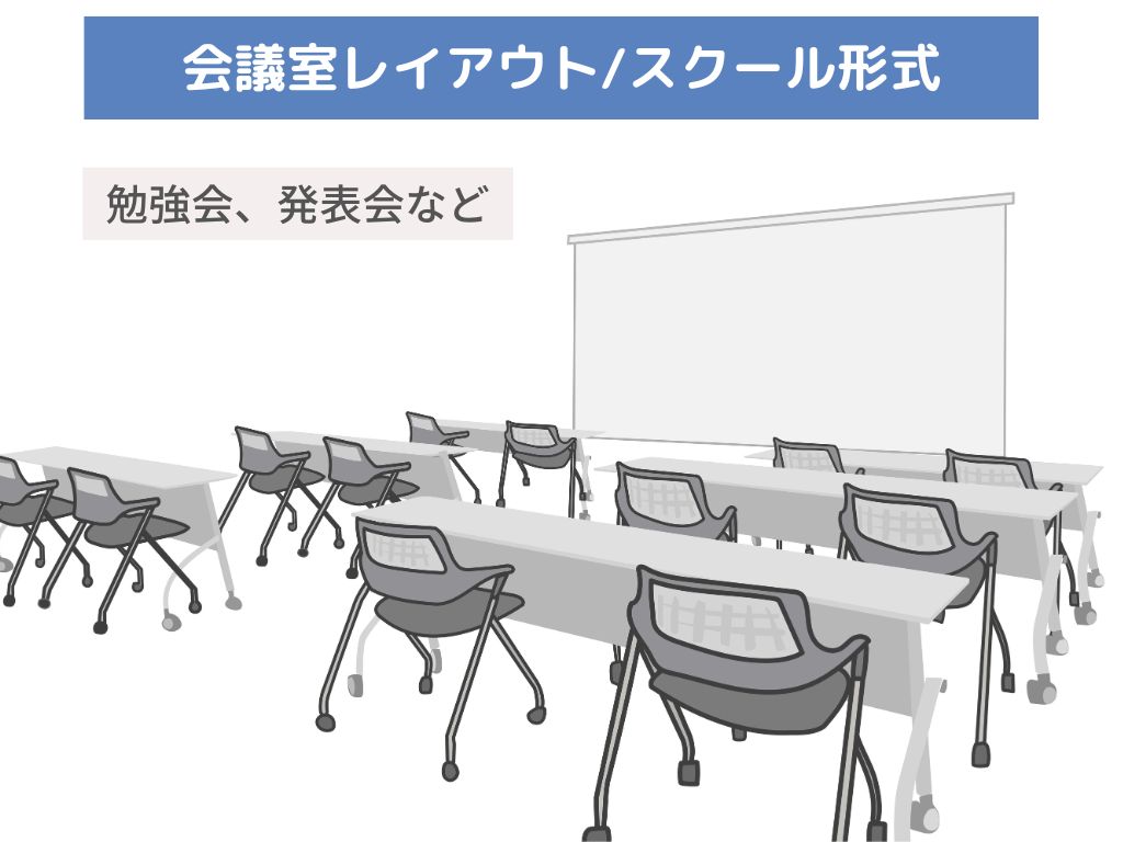 スクリーンやホワイトボードが見やすいよう、全テーブルが前方を向くように配置します。