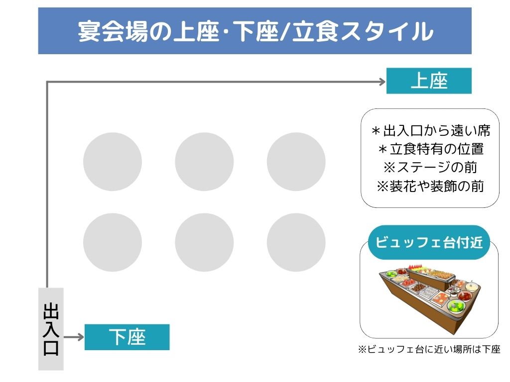 ビュッフェスタイルの立食パーティーでは、出入口から最も遠い席が上座です。