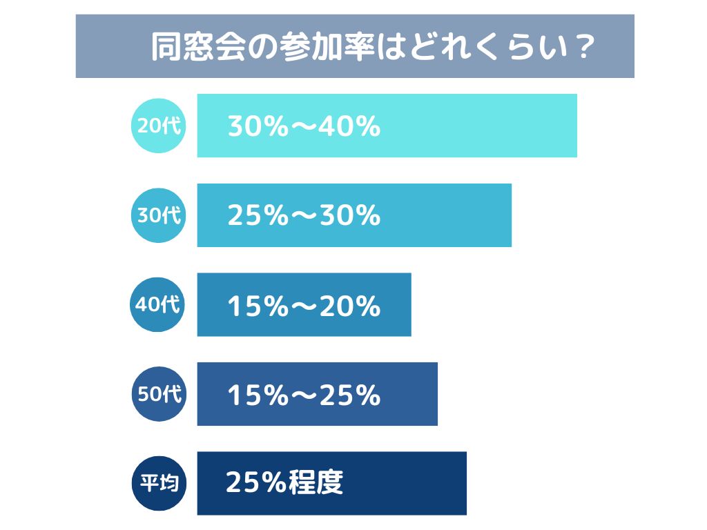 同窓会の参加率は、平均して25%程度とされていますが、これはあくまで全体的な目安です。実際には、年代によって大きく変動します。ここでは、20代から50代までの現役世代の平均的な参加率を紹介します。