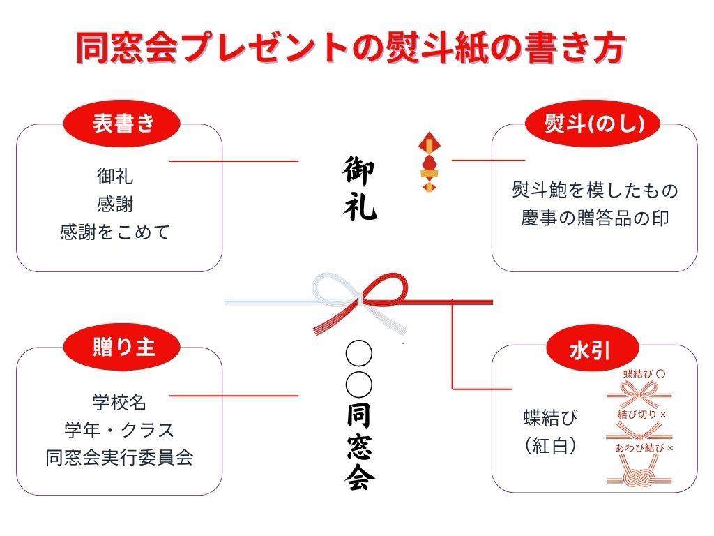 同窓会の趣旨が伝わるように記入します。高校卒業生一同」や「〇〇期生一同」のように、卒業生全員からの贈り物であることを明確に示します。