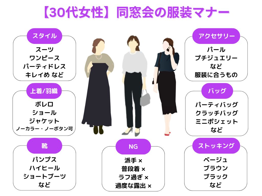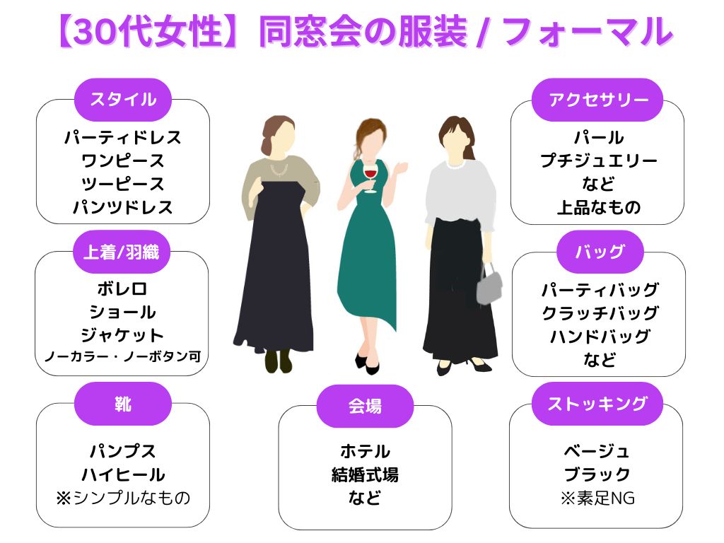 30代女性の同窓会スタイルは、会場の格式、ドレスコード、開催時期を考慮しながら、パーティドレス、ワンピース、スーツなどから選びましょう。