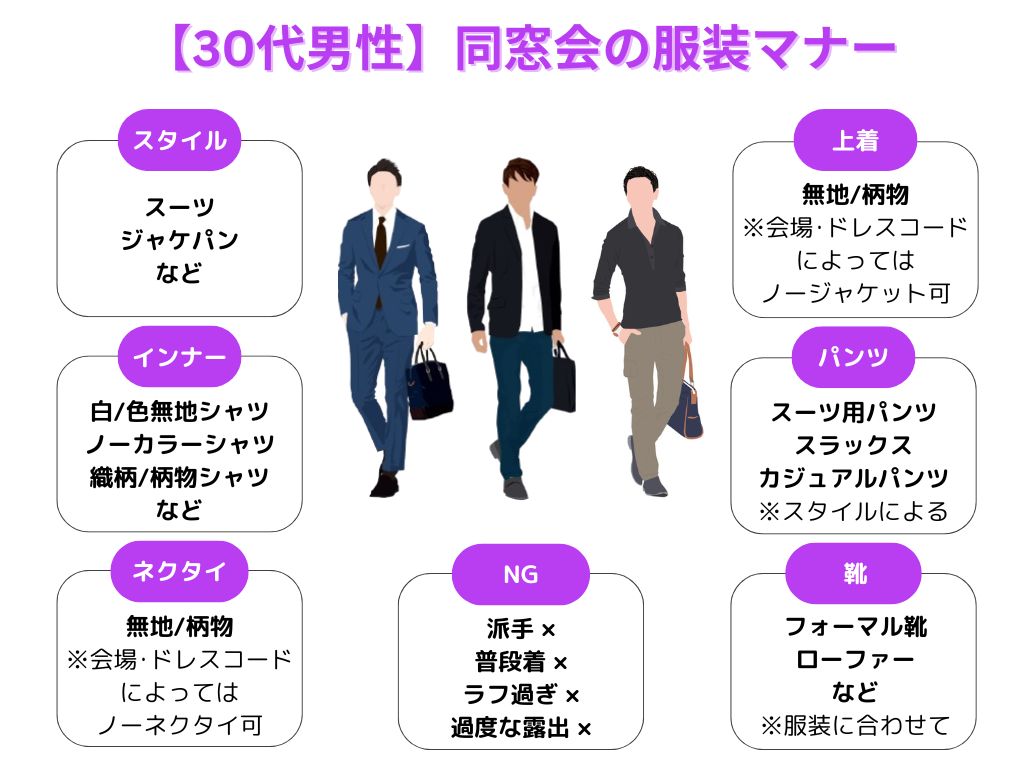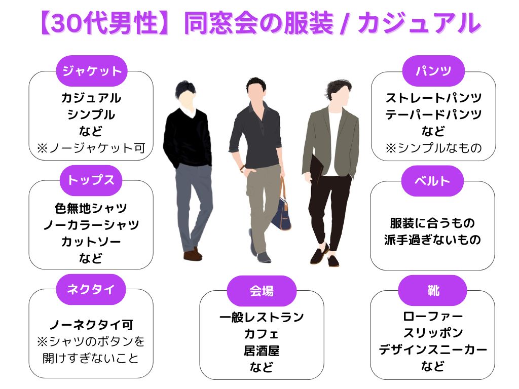 30代男性の同窓会スタイルは、会場の格式、ドレスコード、開催時期を考慮しながら、スーツまたはジャケパンスタイルで臨むのが基本です。