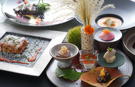 日本の四季をテーマに、シェフの出身地である岩手県の【黄金食財】。旬の野菜や宿毛湾直送の鮮魚など拘りの厳選食材を懐石料理さながらに、少量ずつ多皿で革新的な懐石イタリアンコースに。 イタリアンの大胆さと和食の繊細さを兼ね備えた魅力的な料理の数々をご堪能下さい